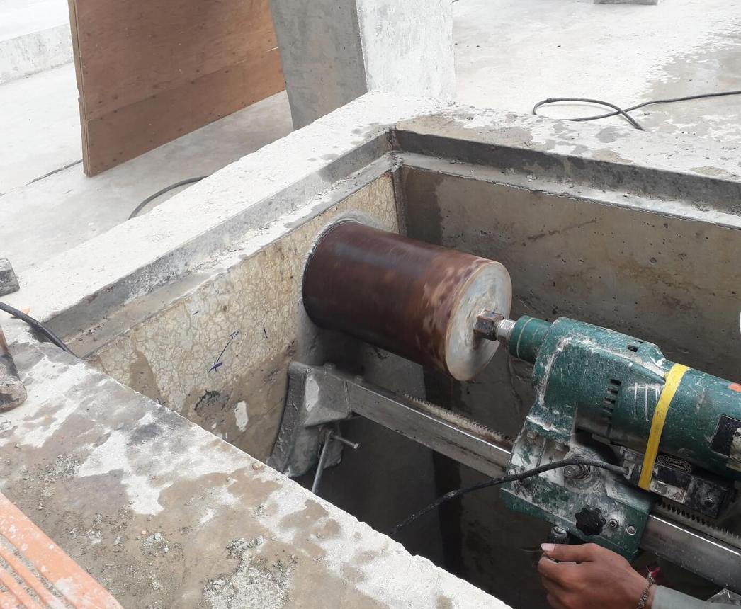 Chúng tôi lựa chọn loại máy khoan phù hợp, chuẩn bị đầy đủ nước làm mát, nguồn điện, dụng cụ bảo hộ, đồng thời che chắn khu vực thi công để đảm bảo vệ sinh.